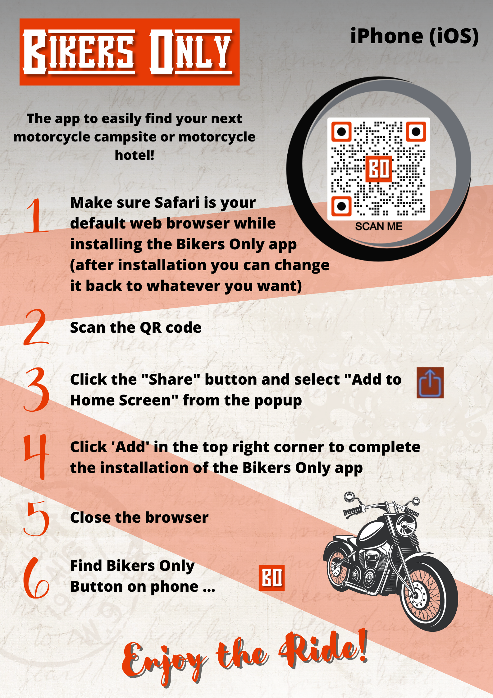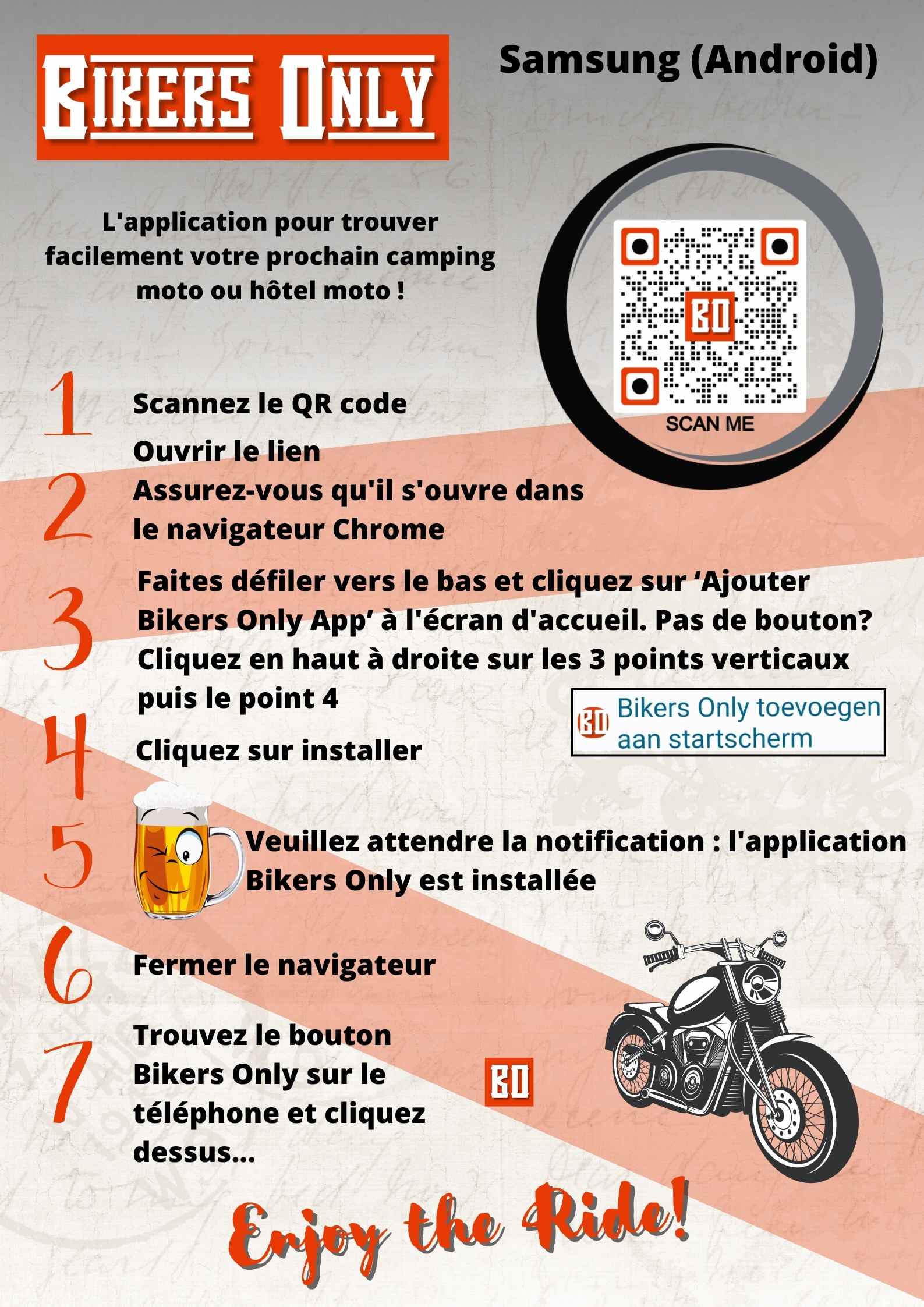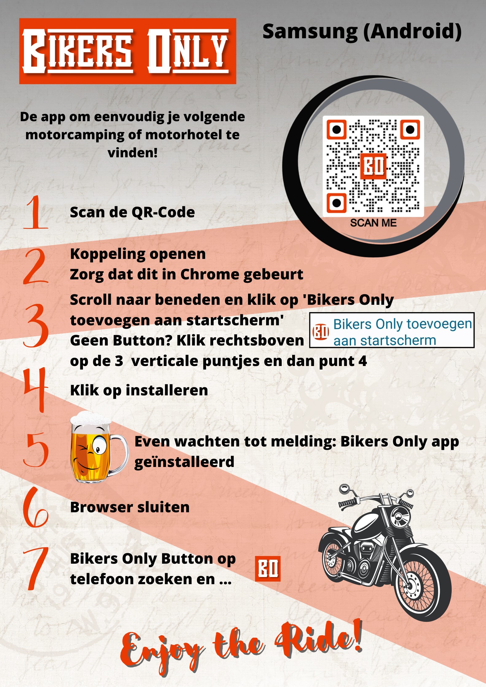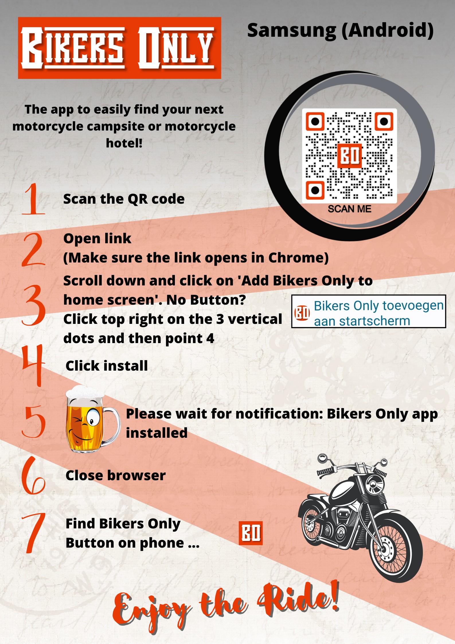 De Bikers Only app opent vervolgens in de browser. Vanuit daar kun je de app eenvoudig installeren op je telefoon. Zo simpel is het!