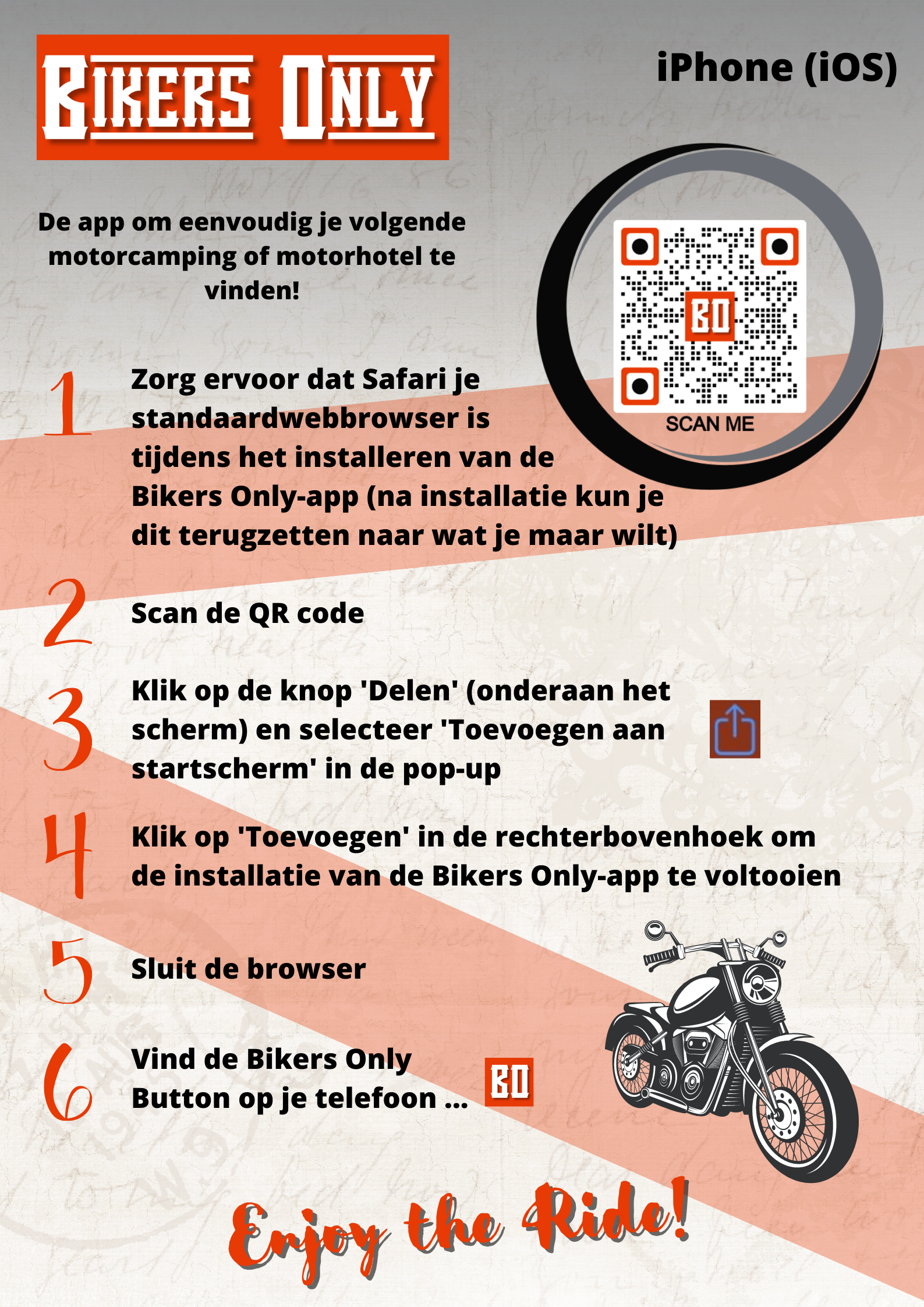 De Bikers Only app is op dit moment (nog) niet beschikbaar via de Play Store of de App Store. Gelukkig kun je de app wel eenvoudig downloaden en installeren, zowel op iOS- als Android-telefoons. Dit kan door de QR-code hiernaast te scannen of door direct deze link te gebruiken.
